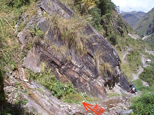 ヒマラヤ山脈の上昇をしめす断層 ここからは、フィールドワークや現場での活動の様子をご紹介します。私は、地質学科の学生とフィールドワークによくでかけました。 これは、ヒマラヤ山脈の上昇をしめす断層の写真です。矢印でしめしたところに大きな断層がはしっていて、これにそって、写真でむこう側(北側)の地層がこちら側(南側)の地層の上におしあがってきています。地層が上におしあがることにより、ヒマラヤ山脈は今でも上昇をつづけています。