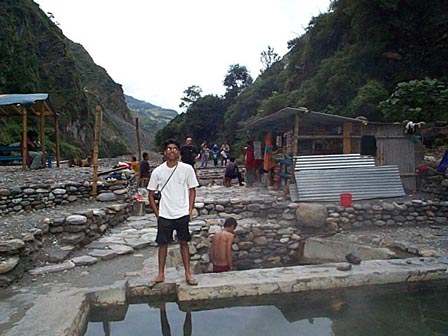 ネパールの温泉「タトパニ」 これは温泉の写真です。「タトパニ」とはネパール語で「熱い水」つまりお湯の意味です。このように湯船(プール)があって、観光客が中に入れるようになっています。ネパールには火山がまったくないのに、なぜ温泉がでるのでしょうか。これは、このそばにさきほどの断層が走っていて、その断層の割れ目にそって、地下深部からお湯がわきだしてくるからです。このタトパニも、地殻変動がこの地域で今でもおこっている証拠になっています。