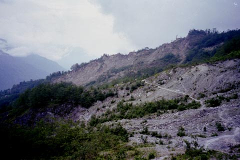 これはネパール極東部のタプレジュン地域の写真です。大規模な地滑り・斜面崩壊がおこっていて、山崩れがすすんでいます。この崩壊地の上部には村があって、そこに危険がせまっています。ネパールでは、雨季に、地滑りや斜面崩壊がごく普通におこります。