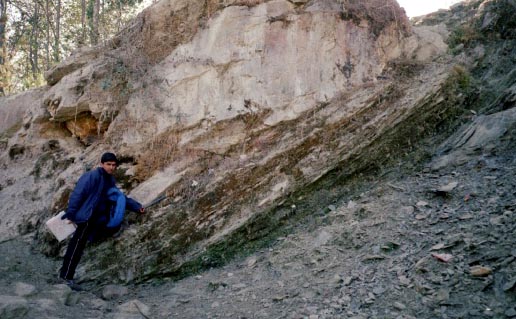 滑り落ちる岩盤 これは、斜面の上から滑り落ちてきた岩盤の写真です。写真の下部の黒っぽい色をした地層は千枚岩(せんまいがん)という岩石からできており、上部の白色の岩石は珪岩(けいがん)という硬質な岩石です。ここでは、千枚岩の地層の上を、滑り台を滑り落ちるように、珪岩の岩体が滑り落ちてきました。 人物は、一緒に調査をしたトリブバン大学地質学科大学院生のプラモッド=ネパール君です。