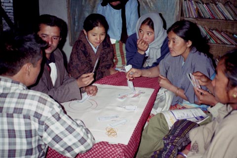 写真は、「パウダルの未来」というテーマで討論をした結果えられたデータや意見を、グループ作業でまとめているところです。討論会、えられた意見のまとめなどのすべてにネパール語をつかいました。