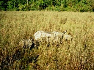 チトワン国立公園の野生のサイの親子 これは、タライにあるチトワン国立公園にいる野生のサイの親子です。この国立公園では、絶滅しかかった動物を保護しています。 ネパールというと、雪と氷のさむい世界とほとんどの外国人がイメージしていますが、タライは亜熱帯に属して気温が高く、最高気温は夏には約40度Cにもなります。ネパールには、とても暑い地域もあるのです。
