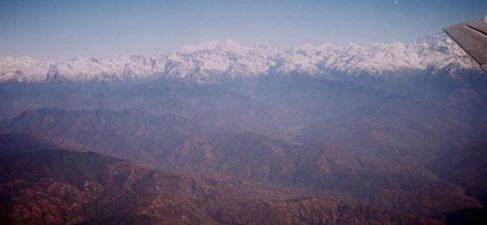 手前の茶色をした地帯がパハール(低ヒマラヤ)で、むこう側の白銀の氷河地帯がヒマール(高ヒマラヤ)です。ヒマール(高ヒマラヤ)は、8000メートル級の峰々がつづき、「世界の屋根」になっています。これは、飛行機からとった写真です。