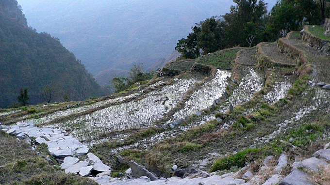 バイスリから約3時間、標高約1500メートル、水田テラスが見えてくる。水田があるのはこのあたりの標高までである。この上部に集落がある。