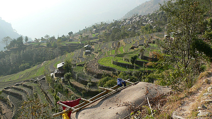 アウロ村は、高低差約1000メートルの切り立った岩崖を背景にし、比較的傾斜がゆるやかなせまい部分に集落が発達している。写真では、階段状耕作地の奥に集落が見える。 アウロ村で栽培されている作物は、稲(水稲)・小麦・ジャガイモ・サツマイモ・カラシ菜・カリフラワー・ニンジン・ダイコン・タマネギ・カボチャ・タロイモ・サトウキビ・ショウガ・ニンニク・唐辛子・ターメリック・トウモロコシ・ソバ・大豆・各種豆類(インゲン豆・エンドウ豆など)・シコクビエ・ポンカン・ライム・バナナ・パパイヤなどである。