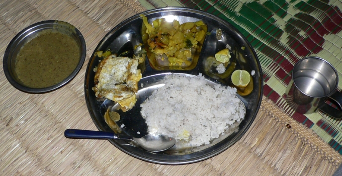 アウロ村では、苗畑管理人のチャンドラ=バハドゥール=プンさんのお宅に宿泊した。食事は、ネパールの家庭料理「ダルバート」である。ライス・野菜カレー・豆スープ・つけものがセットになっている。また地酒「ロキシー」もご馳走になる。
