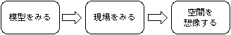 3.<模型を中核にして想像をふくらませる> 今回の行為の中でポイントとなったのは、博物館の模型を中核にして、歴史的な建築物について想像をふくらませたところにある。 現在は存在しないものをあるものとして心の中に再現していく。さらに、模型になっていない部分にまで想像をひろげ、心象により全体像をつかんでいく。想像といっても勝手気ままにおこなうのではなく、あくまでも博物館の研究成果を中核にしておこなう。 |